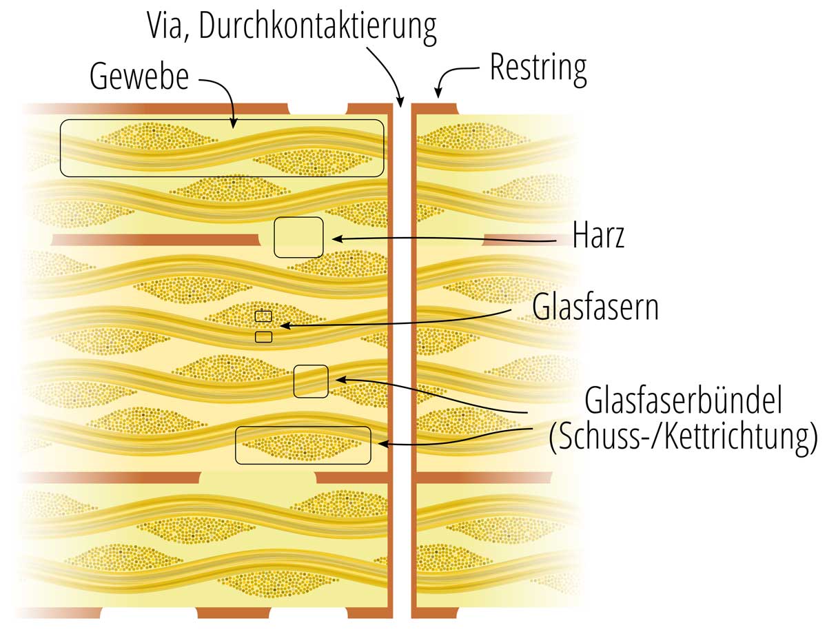 Grafische Darstellung einer 4-lagigen Leiterplatte mit Glasfasern Im Querschnitt eines 4-Lagen-Multilayers sind viele Details zu erkennen. Zu sehen sind die einzelnen Glasfasern, die ein Bündel bilden, die verwoben sind. Anschließend werden eines oder mehrere dieser Gewebe in Harz eingebettet. Beim Aufbaus der elektrischen Lagen wird Kupfer hinzugefügt, um das Leiterbild zu erstellen.