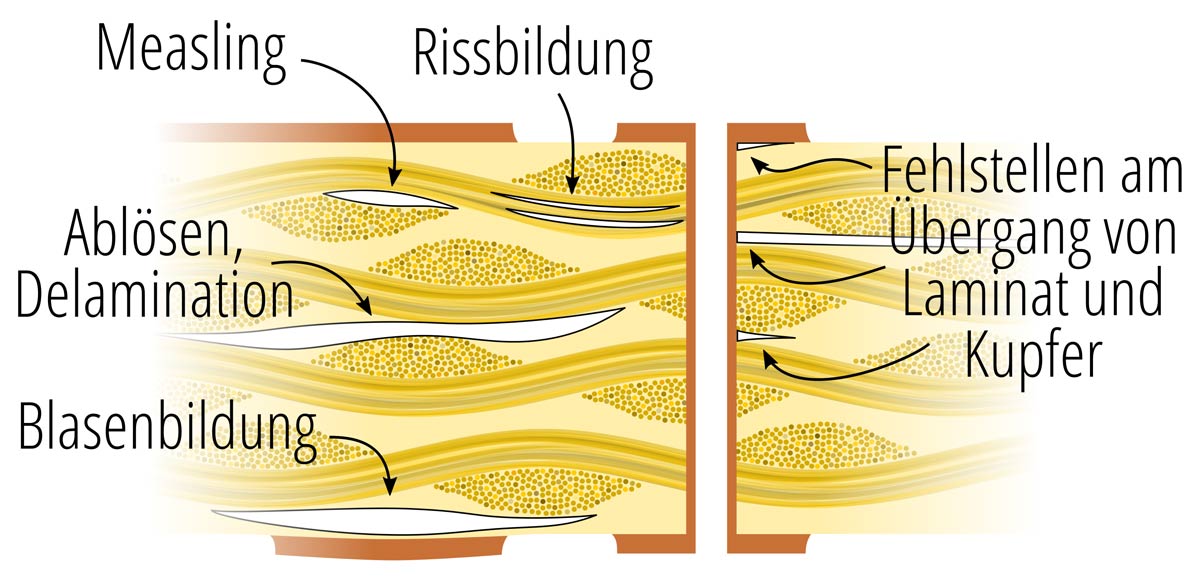 • Delamination/Blistering: Trennungen im Basismaterial, zwischen einzelnen Gewebelagen (Lagen) oder zwischen Basismaterial, Kupferfolie oder Beschichtung, z.B. Lötstoppmaske