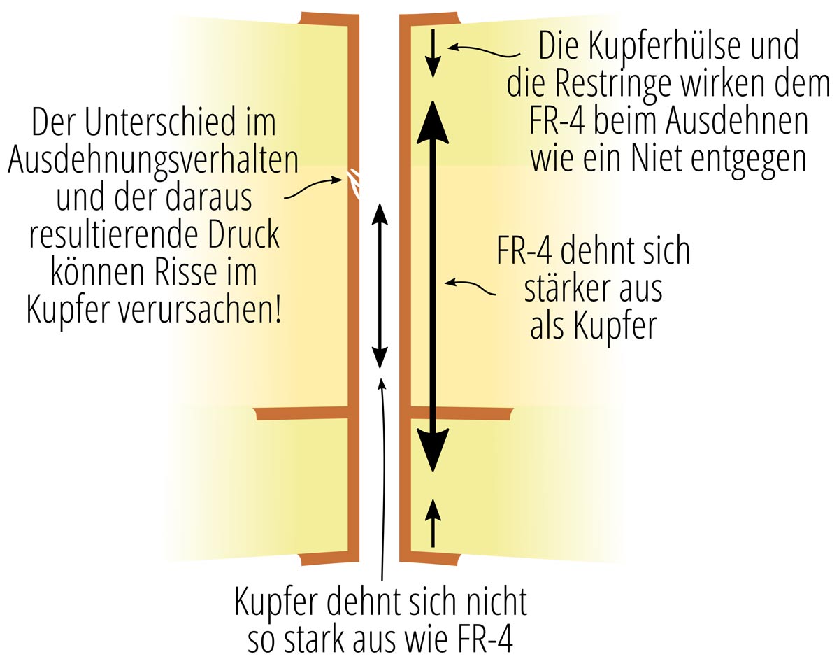 Grafische Darstellung eines Durchgangslochs in einer Leiterplatte mit Rissen im Kupfer Kupfer hat einen niedrigen CTE im Vergleich zum CTEz von FR-4. Die Kupferhülse innerhalb des FR-4 widersetzt sich daher der Ausdehnung und kann reißen.