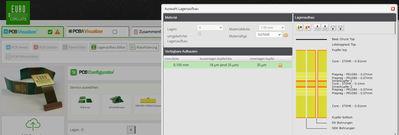 Die Informationen über die von uns verwendeten Materialien finden Sie immer auf unserer Download-Seite. Ein praktischer Ort, um zu sehen, welche Materialien wir für Ihren Aufbau verwenden werden, ist der Lagenaufbau Editor. Hier sehen Designer die einzelnen Kerne und Prepregs, ihren Typ und ihre Höhe. Einige Beispiele sind unten abgebildet:
