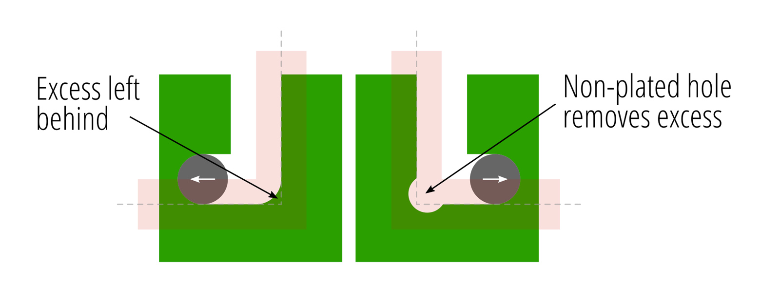 Die am meisten verwendeten Fräsbohrer haben einen Durchmesser von 2 mm, was einen Eckenradius von 1 mm ergibt. Für kleinere Radien müssen Sie herausfinden, ob der Hersteller dazu in der Lage ist. In den meisten Fällen müssen Sie diese Anforderung explizit angeben; andernfalls würden Sie ihren Standard-Bit verwenden und den Überstand dort lassen. Aber Sie können diese Einschränkung umgehen und vielleicht auch höhere Kosten vermeiden, indem Sie ein nicht plattiertes Loch an der Ecke platzieren, um den Überstand wegzunehmen.
