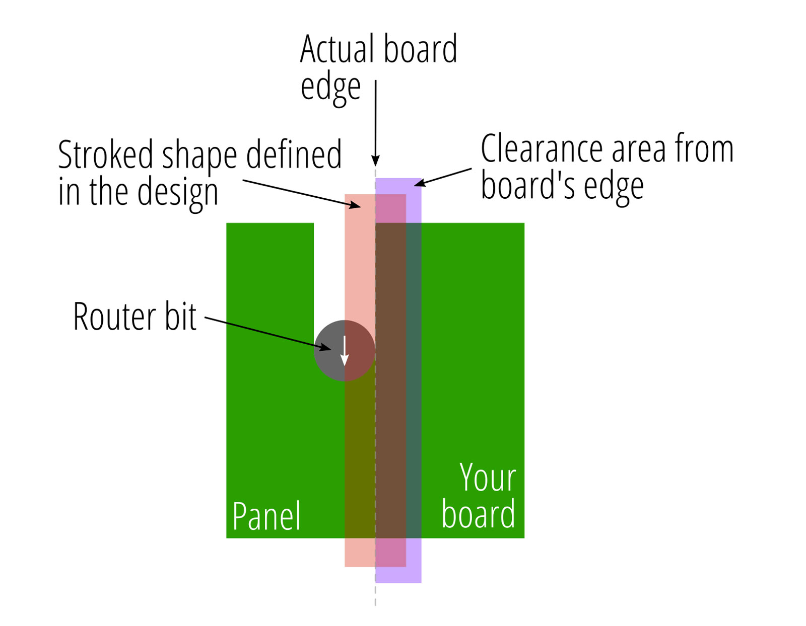 Das EDA-Tool hat die Außenkontur mit einer gestrichelten Linie (rot) definiert. Die Mitte dieser Linie wird als die eigentliche Leiterplattenkante angesehen. Normalerweise gibt es auch die Vorgabe, Kupfer in einem bestimmten Abstand von der Kante freizuhalten (lila). Zum Trennen der einzelnen Leiterplatte von einem Nutzen wird ein Router-Bit verwendet.