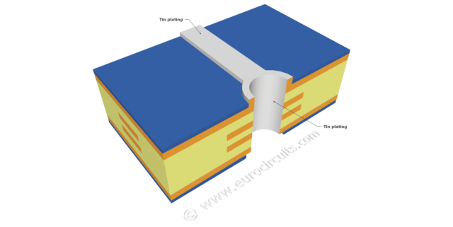 Die Bäder sind derart konstruiert das sie eine gleichmäßige Kupferdicke auf dem Nutzen ergeben. Sobald sich das Kupfer auf dem Nutzen befindet wird eine dünne Zinnschicht abgeschieden. Dieses ist für den nächsten Verarbeitunsschritt erforderlich, in welchem wir die unerwünschten Kupferflächen abätzen wollen.