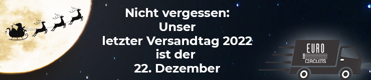 Wenn wir in der ersten Januarwoche 2023 den Betrieb wieder öffnen, läuft unsere Leiterplattenfertigung wie gewohnt mit voller Leistung. Unsere Leiterplattenbestückung arbeitet dagegen nur mit halber Kraft. Das kann möglicherweise zu kurzen Verzögerungen führen.