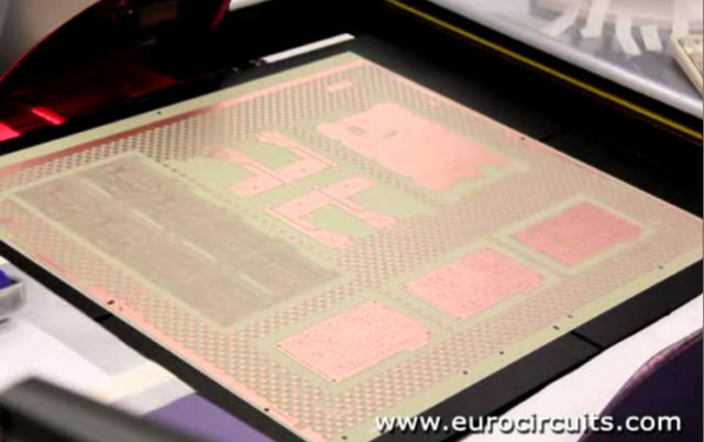 Die Innenlage unseres Multilayers ist jetzt fertig. Als nächstes müssen Registrierungslöcher gestanzt werden mit denen die Innenlagen zu den Aussenlagen ausgerichtet werden. Der Bediener lädt die Innenlage in die optische Stanze, welche die Registriermarken im Kupfer ausrichtet und anschliessend die Registrierungslöcher stanzt…