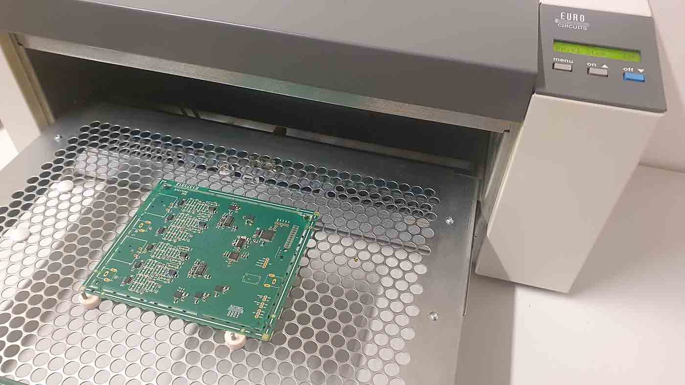Die von Eurocircuits gefertigte Leiterplatte ist in Bild 3 zu sehen. Ferner ist diese mit Lotpaste gerackelt und bereits mit allen SMD-Bauteilen bestückt worden. Als nächsten Schritt wird die Baugruppe im Reflow-Ofen gelötet.