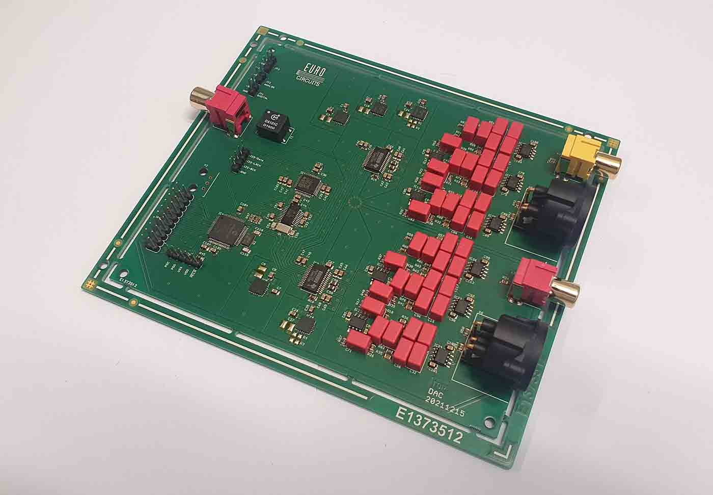 Bild 4: Vollständig bestückte Leiterplatte des Audio-DACs mit FKP 2 Kondensatoren.