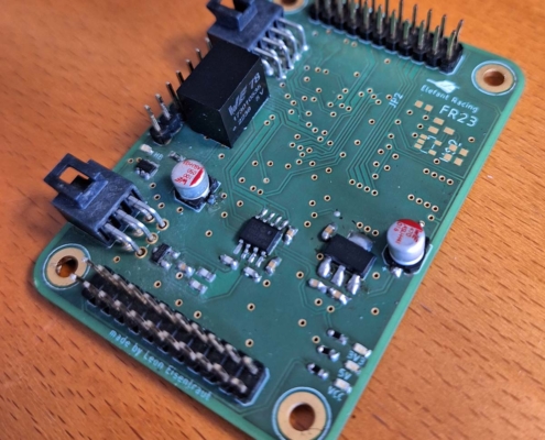 Der Boardcomputer des FR23 bleibt auf dem Raspberry Pi der 4. Generation aufgebaut. Für diesen wurde eine eigene Platine entwickelt, die auf den Raspberry Pi aufgesteckt wird und einen zusätzlichen leistungsstarken Mikrocontroller beinhaltet.