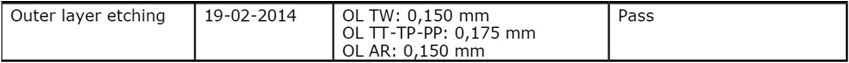 Jeder Produktions-Nutzen besitzt einen speziell entwickelten Test-Coupon, welcher Aufschluss darüber gibt, ob der Nutzen korrekt geätzt wurde und das die Leiterbahnbreiten und -isolationsabstände stimmen. In den “PCB passport” wird der Ätzresist-Typ, sowie die Werte für Leiterbahnbreite, Isolationsabstände und Restringbreite eingetragen.