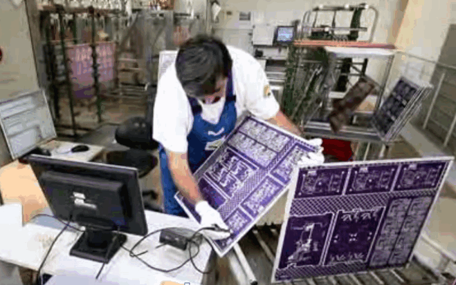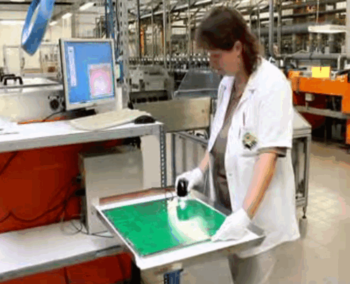 Der Bediener prüft den Bestückungsdruck auf jedem Nutzen auf Sauberkeit, Lesbarkeit ohne Verlaufen und Verschmieren.