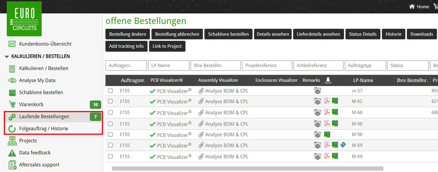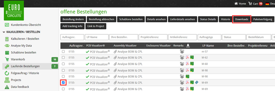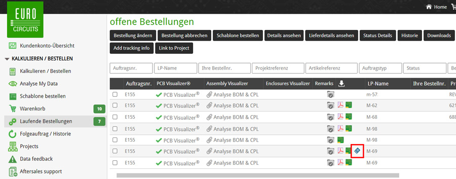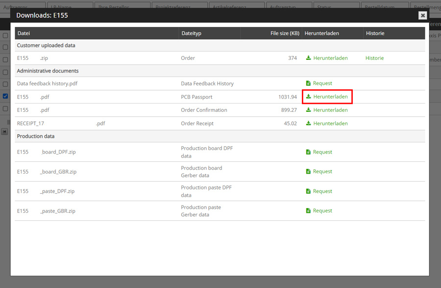Um den PCB-Pass für eine bestimmte Bestellung herunterzuladen, können Sie entweder auf das Symbol PCB-Passl