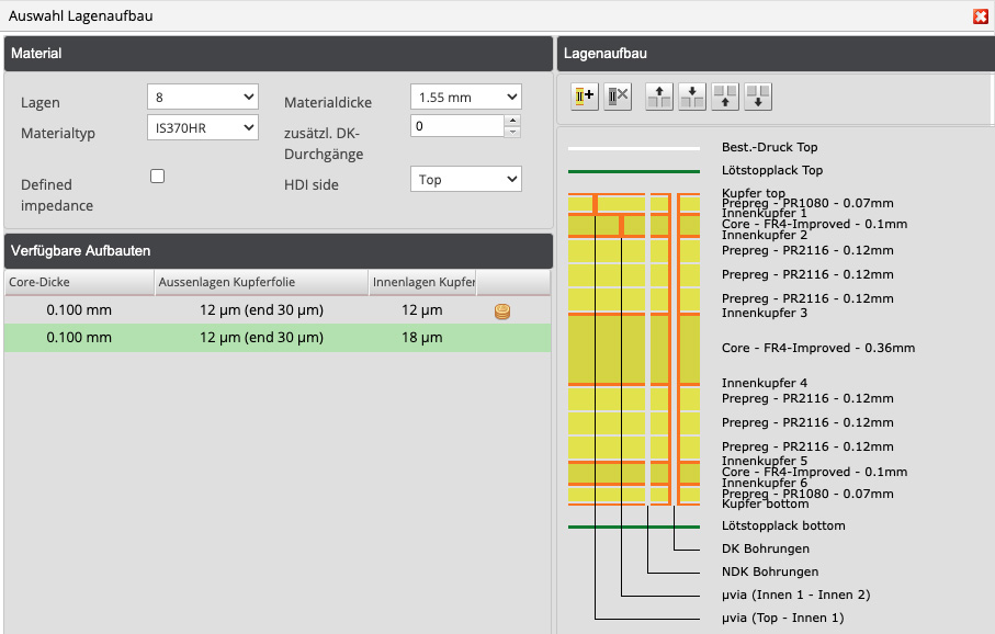 Schnellstart mit HDI: Den Einstieg in die HDI-Technik vereinfachen unsere vordefinierten 6- oder 8-lagige Multilayerkonstruktionen mit zwei Microvia-Lagen auf der Ober- oder Unterseite.