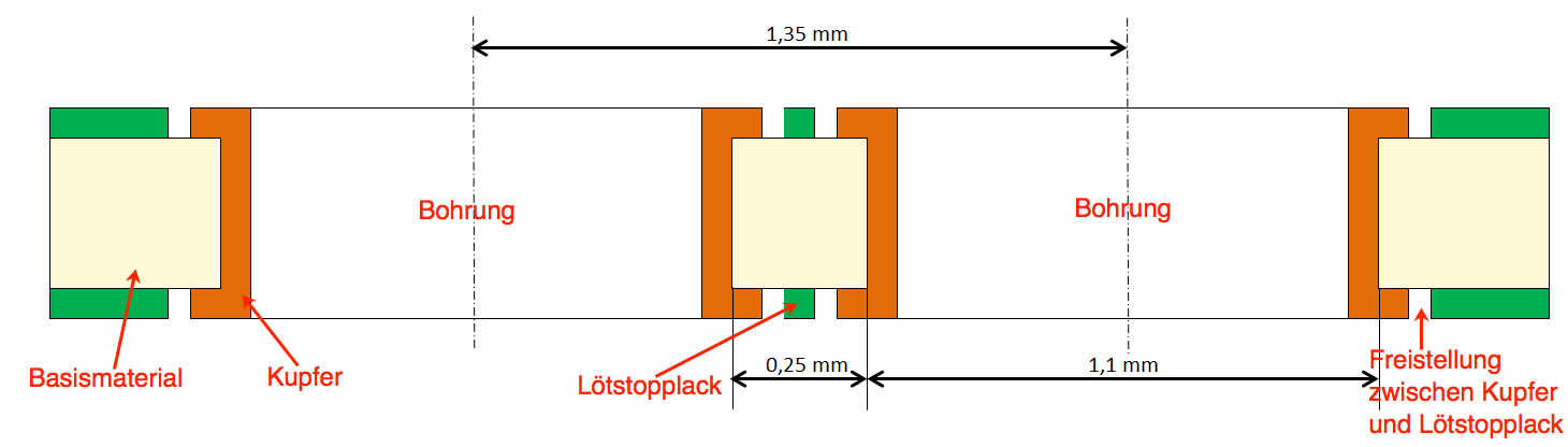 DK-Bohrungen, die zu verschiedenen Netzen gehören, benötigen wenigstens 0,25mm Basismaterial zwischen den Lochwandungen, um hoch-ohmige Kurzschlüsse zu vermeiden. Zur Berechnung müssen Sie den Werkzeugdurchmesser des Bohrers heranziehen, welcher 0,10mm größer ist als der Enddurchmesser. Eine 1,00mm DK-Endlochdurchmesser wird mit einem 1,10mm Werkzeug gebohrt. Damit Sie 0,25mm Basismaterial zwischen den DK-Löchern von 1,00mm belassen, müssen deren Zentren 1.35mm auseinander liegen. Anders herum ausgedrückt: Die Endloch-Durchmesser (hier 1,00mm) zweier DK-Bohrungen müssen 0,35mm auseinander liegen.
