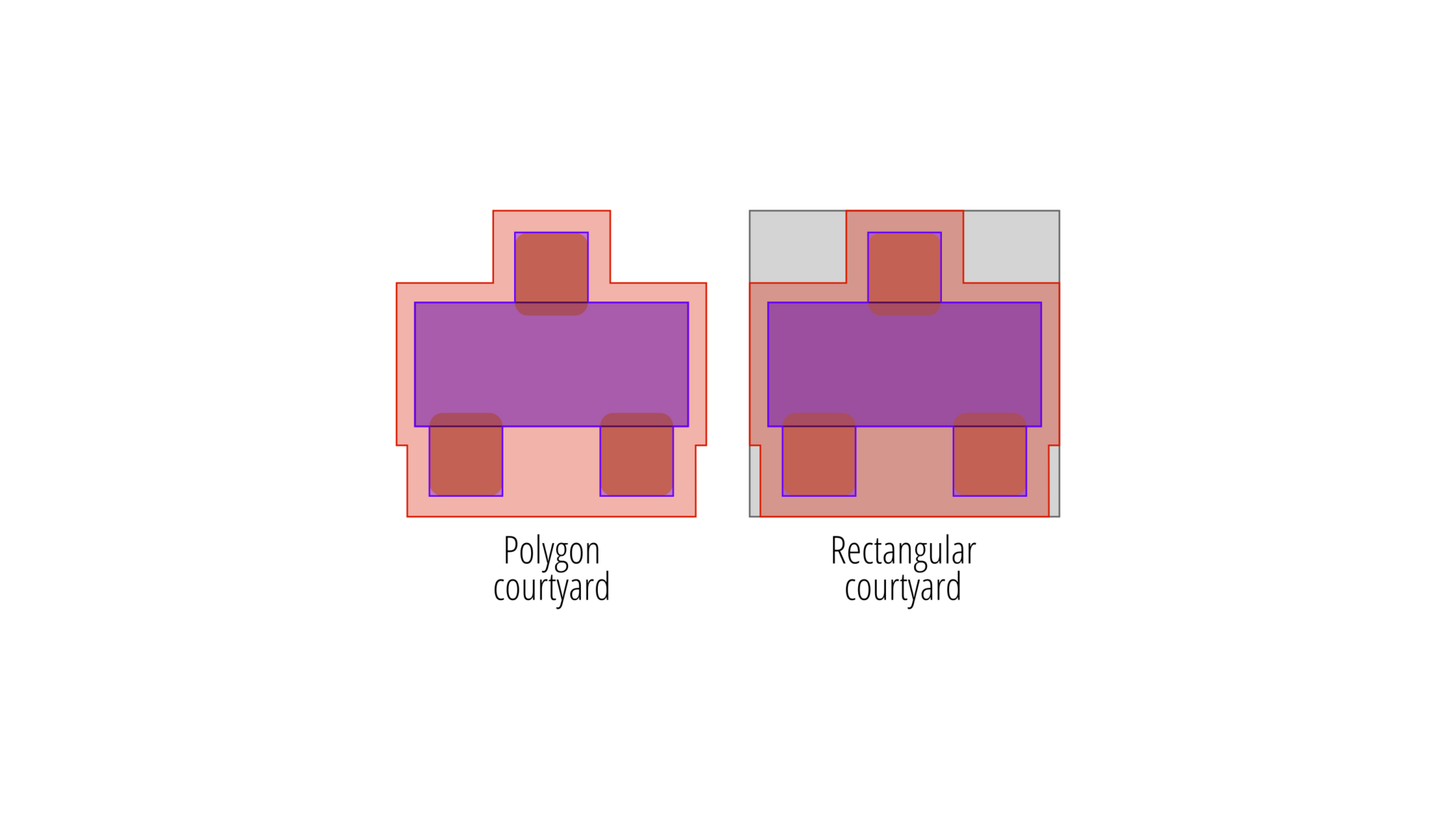 A7-courtyard-overview Der Courtyard wird in einem Abstand von der physikalischen Grenze des Bauteilrandes definiert. Die Fläche dieses Abstandes abzüglich der Bauteilfläche ist der “Überschuss” (Courtyard excess).