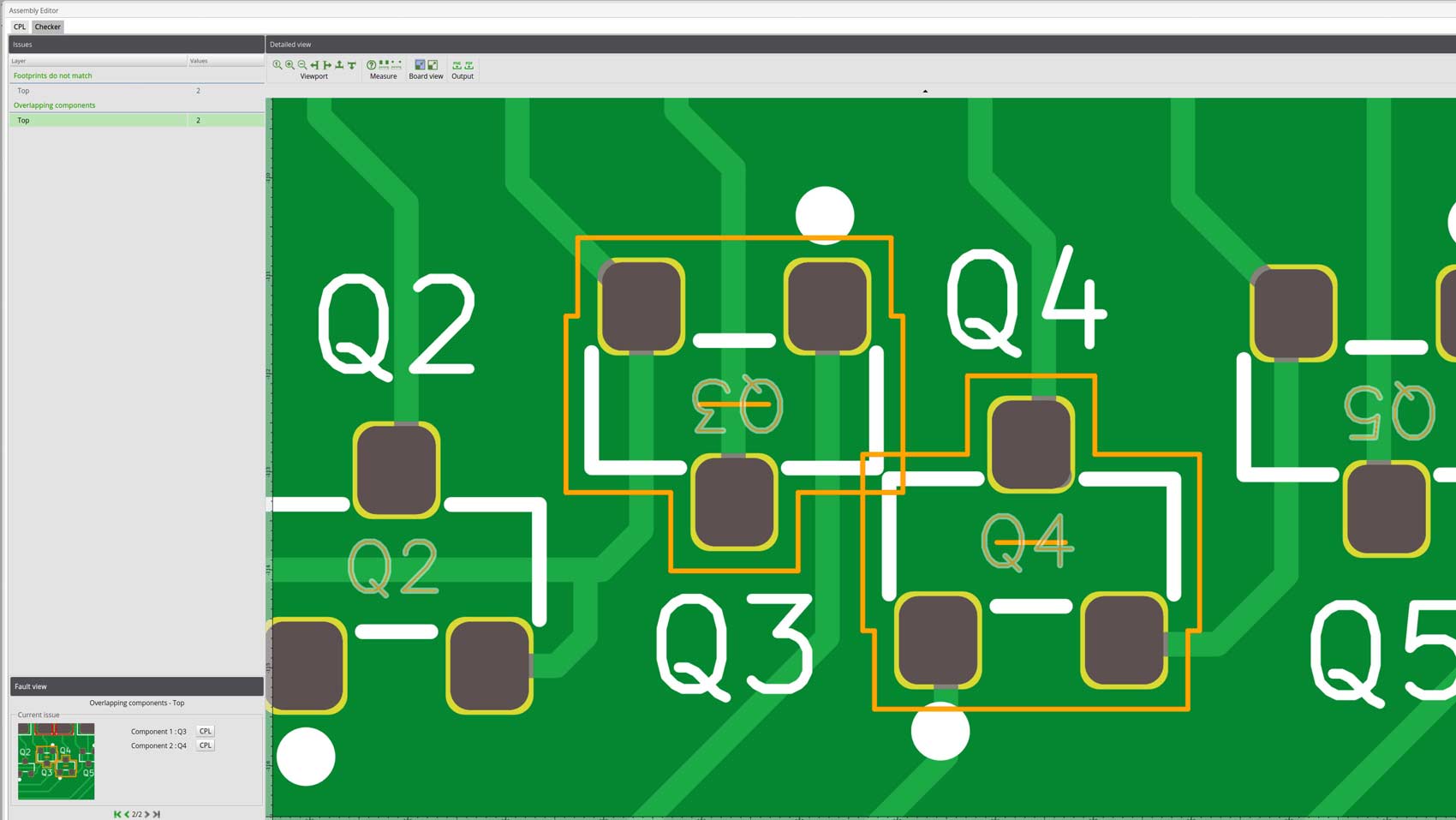 A7-courtyard-violation-vis-q3q4 Im ersten Bild sehen wir die Ansicht in KiCAD mit Pfeilen, die auf Verletzungen der Courtyards nach Ausführung des DRC zeigen, speziell Q1-Q4. Im zweiten Bild haben wir die Ansicht des CPL Editors von Eurocircuits Visualizer; der CPL Checker wird den Abstand zwischen Q1 und Q2 akzeptieren, weil er die Fertigungsmöglichkeiten von Eurocircuits und nicht die IPC-Regeln berücksichtigt. Trotzdem ist es ein gute Stelle um zu prüfen, wo die IPC-Regeln verletzt werden, so dass sie gegebenenfalls behoben werden können. Im letzten Bild sehen wir den CPL Checker, der sich über die Verletzung des Coutyard zwischen Q3 und Q4 beschwert. Eurocircuits wird dieses Design nicht fertigen.