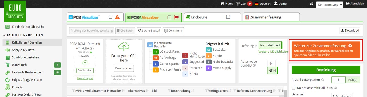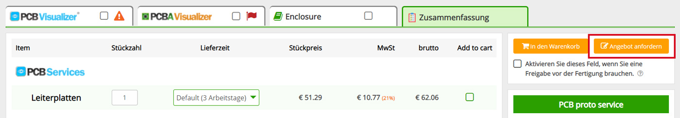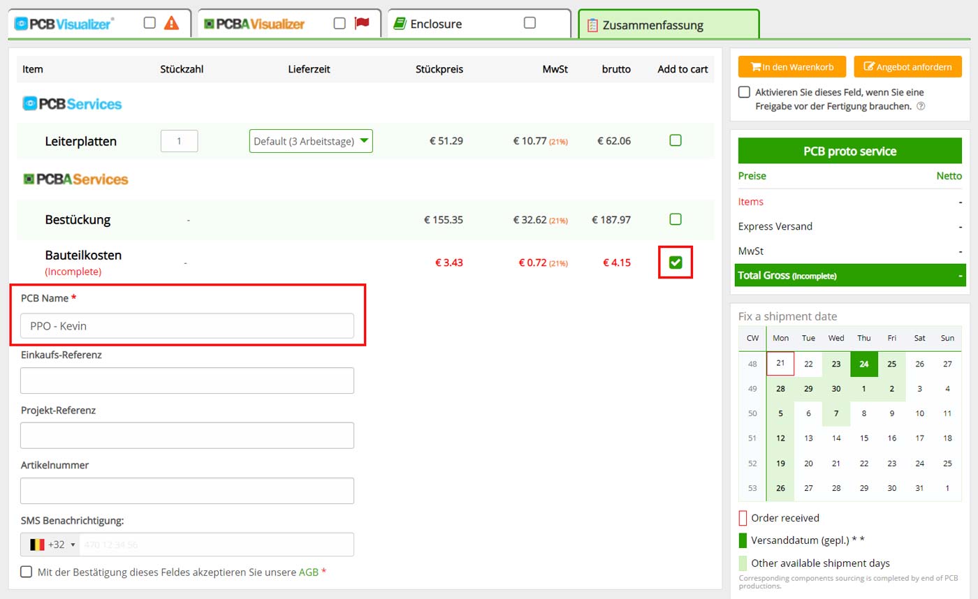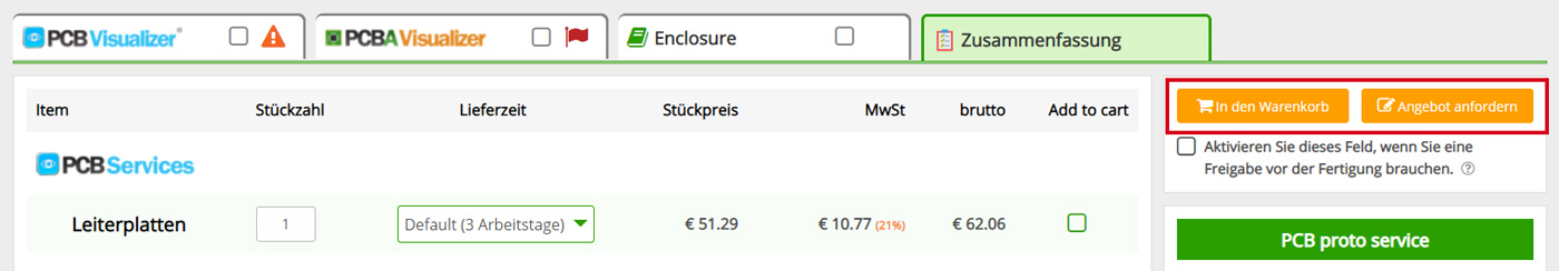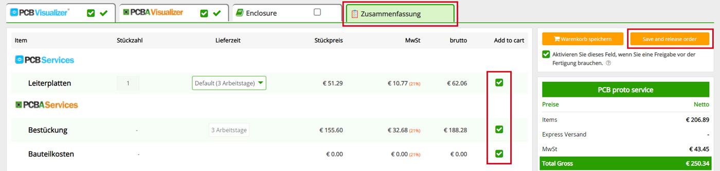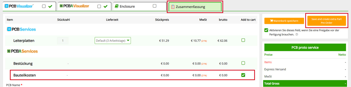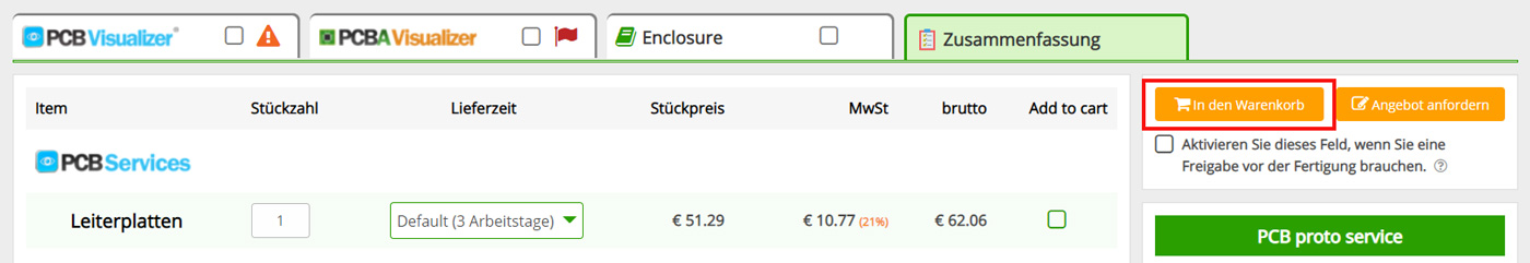 Klicken Sie auf die Registerkarte Zusammenfassung und vergewissern Sie sich, dass das Häkchen für die Zeile Leiterplatte, Bestückung und Bauteile in der Spalte zum Warenkorb hinzufügen gesetzt ist.
