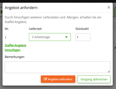 Es gibt zwei orangefarbene Schalflächen (oben rechts), In den Warenkorb oder Anfrage starten. Davon müssen Sie eine anklicken, um entweder Ihre Stückliste im Warenkorb zu speichern oder eine Anfrage für weitere Hilfe von unseren Ingenieuren zu starten.