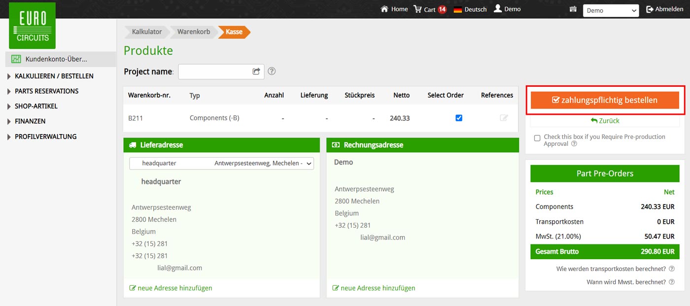 - Zu diesem Zeitpunkt haben Sie noch keine Bestellung für die Bauteile aufgegeben, das PPO wurde lediglich als Artikel in Ihrem Warenkorb gespeichert.