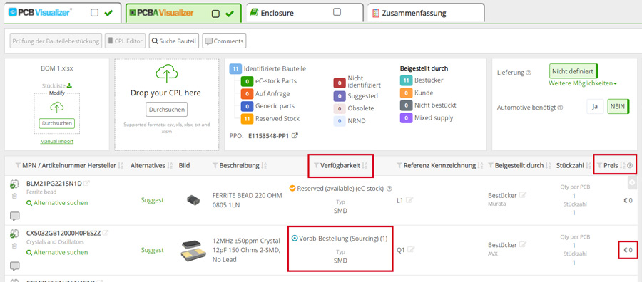 Im PCBA Visualizer werden alle Bauteile, die über den PPO-Service bestellt wurden, in der Spalte Verfügbarkeit als vorbestellt gekennzeichnet.