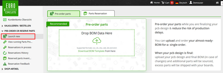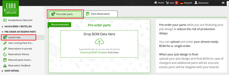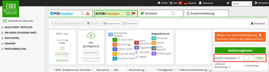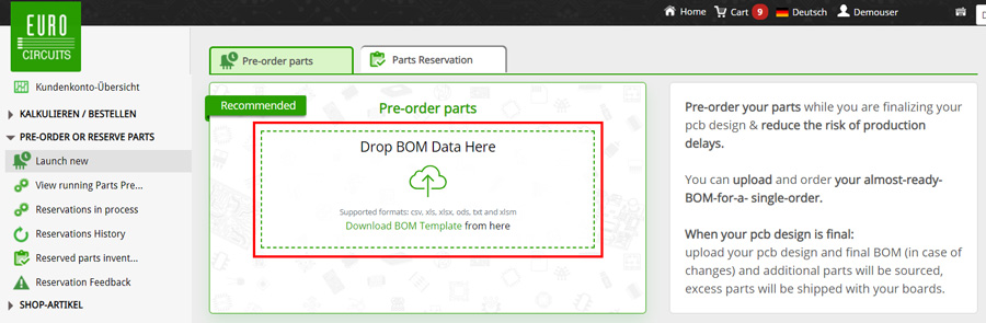 Ist das Leiterplattendesign fertig, können unsere Kunden die Leiterplattendaten und die endgültige Stückliste in die Bauteilevorbestellung im Eurocircuits-Kundenkonto hochladen, die dann den normalen Bestellprozess durchläuft.
