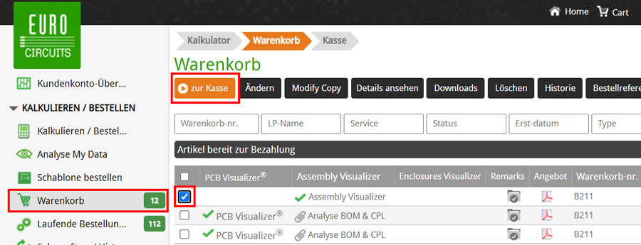 Um die Bauteile über den PPO-Service zu bestellen, gehen Sie zunächst in Ihren Warenkorb und setzen Sie ein Häkchen in das Kästchen links neben der entsprechenden Zeile.