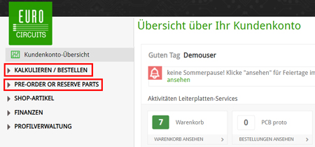 Um Bauteile vorzubestellen, melden Sie sich zunächst bei Ihrem Eurocircuits-Kundenkonto an. Es öffnet sich das Fenster Kundenbericht.