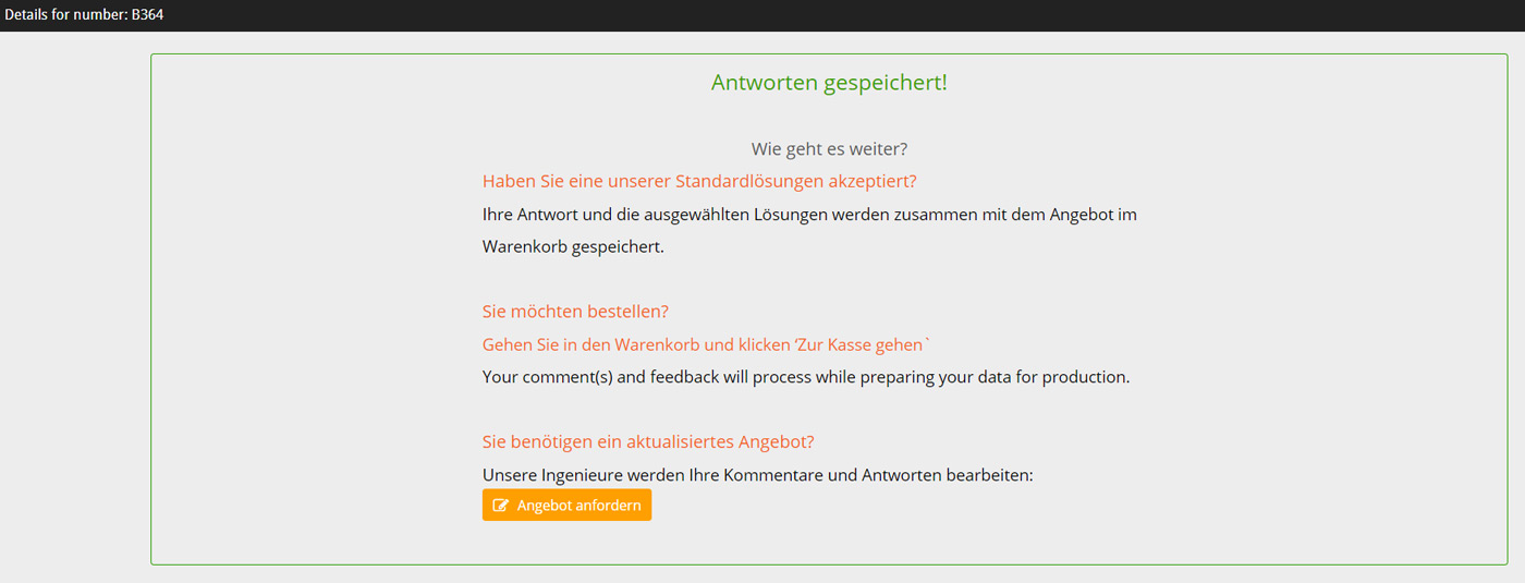 Es öffnet sich ein neues Fenster. Darin werden Sie darüber informiert werden, dass Ihr Feedback und die ausgewählten Lösungen zusammen mit dem Angebot in Ihrem Warenkorb gespeichert wurden.