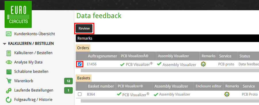 Das Daten Feedback ist Eurocircuits Kommunikationsweg, um Sie zu informieren, dass wir Ihre Beiträge brauchen, damit wir Ihre Bestellung bearbeiten können.