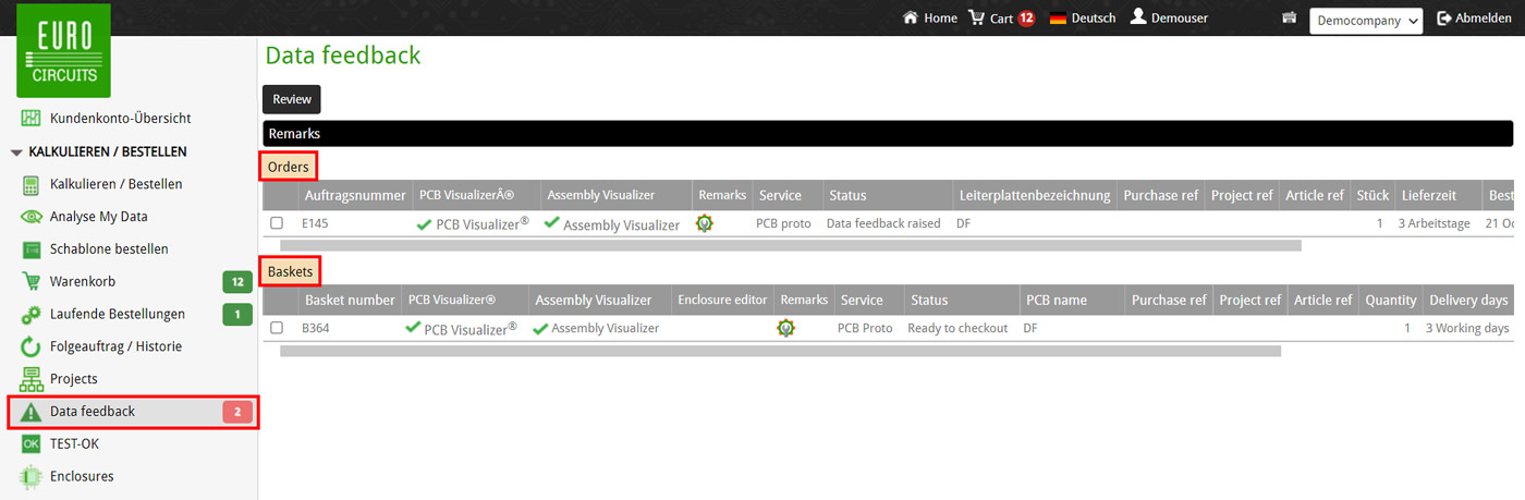 - Bestellungen – enthält laufende Bestellungen, die Ihre Eingabe über das Daten Feedback erfordern, um Ihre Bestellung zu bearbeiten.