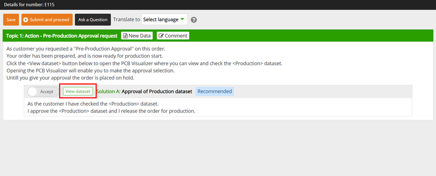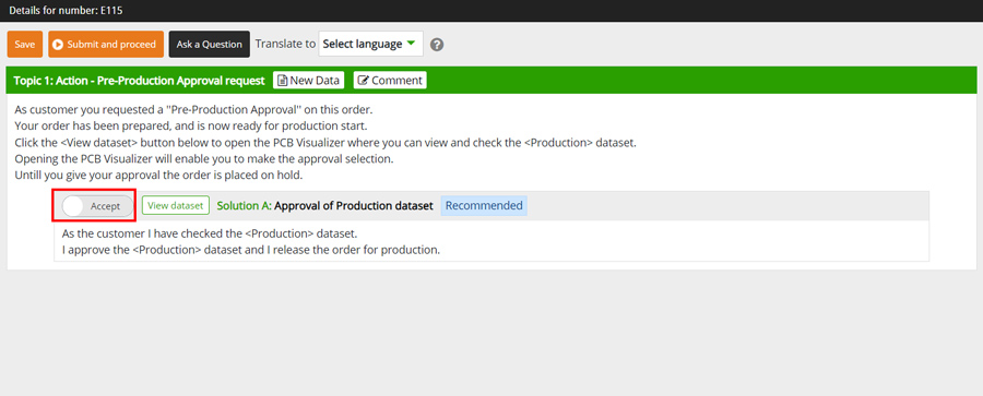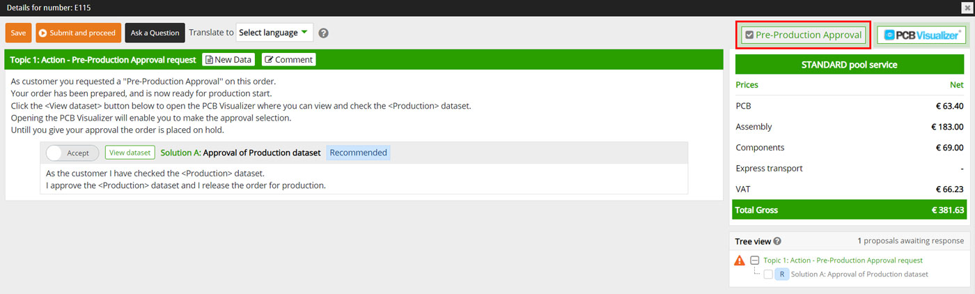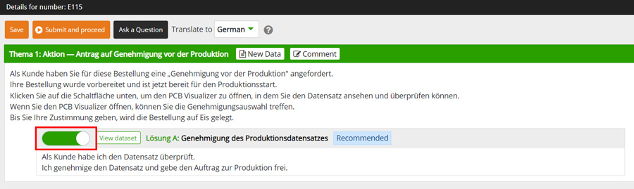Wenn Sie bei der Auftragserteilung eine Produktionsfreigabe (PPA) angefordert haben, genehmigen Sie die Produktionsdaten, bevor wir mit der Fertigung Ihres Auftrags beginnen können.