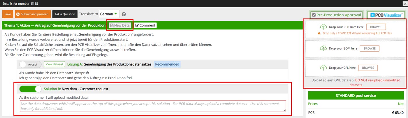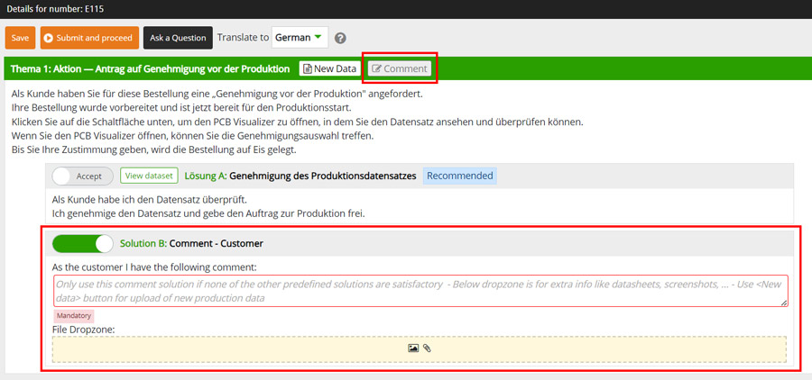 Wenn Sie Anmerkungen zu dem Datensatz machen möchten, klicken Sie auf die Schaltfläche Kommentar. Daraufhin wird eine alternative Lösung B angezeigt, in der Sie Kommentare hinterlassen und Bilder hochladen können.