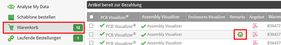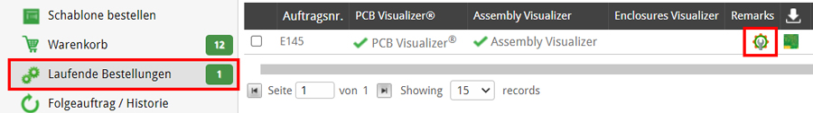 Symbol in der Spalte Bemerkungen des entsprechenden Warenkorbes oder der laufenden Bestellung klicken. Wenn das Symbol grau ist, ist der Daten-Feedback-Prozess abgeschlossen.