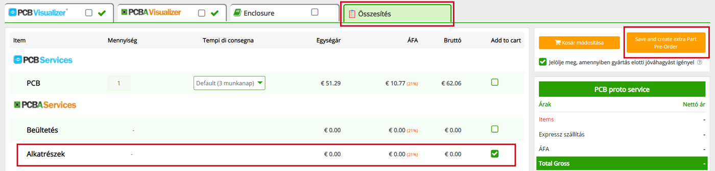 - Amennyiben nem kívánja igénybe venni az Alkatrész szolgáltatást, kattintson a Mégsem gombra, és visszatér az Összesítés fülre.