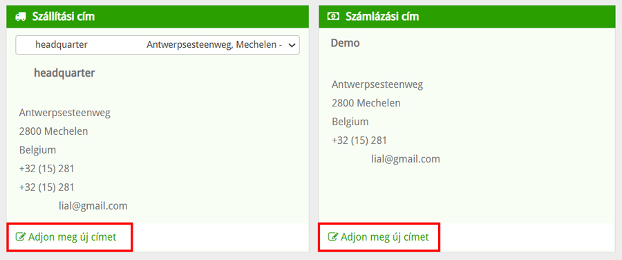 - A szállítási vagy a számlázási cím változtatása a Címek kezelése linkre kattintva lehetséges (amennyiben rendelkezik a szükséges fiókjogosultságokkal), ami a Szállítási cím és a Számlázási cím alatt található.