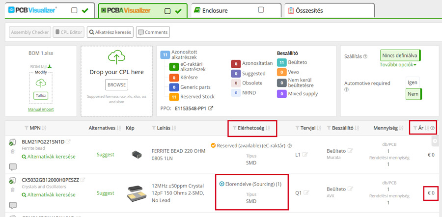A PCBA Visualizerben a PPO szolgáltatással előrendelt alkatrészek az Elérhetőség oszlopban Előrendelve státusszal jelennek meg.