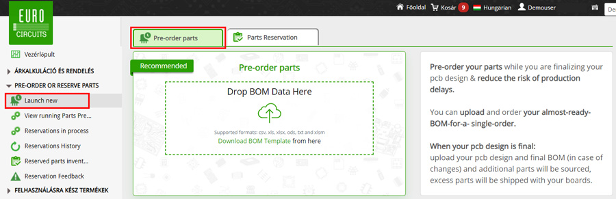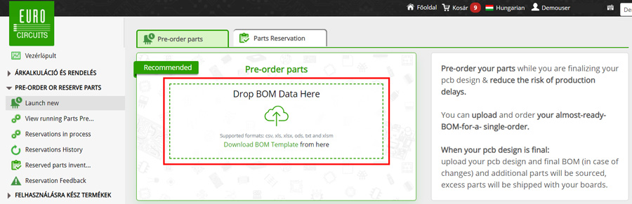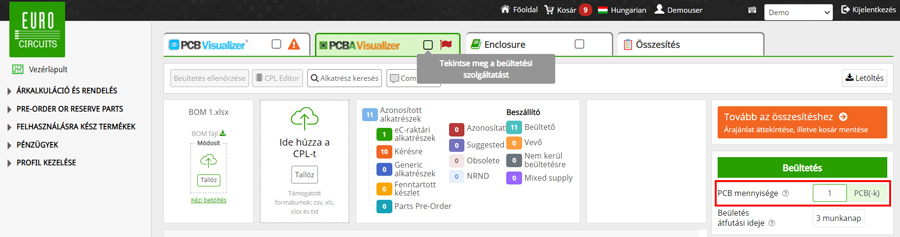 Amint a vevői dokumentáció véglegessé válik, az Eurocircuits fiókban a PPO megrendeléshez feltölthetők a PCB adatok és a teljes BOM fájl, amely ezután a szokásos megrendelési folyamatot követi.