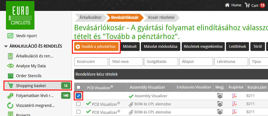 A PPO szolgáltatással történő alkatrészrendeléshez először kattintson a Bevásárlókosár menüpontra, majd válassza ki a megfelelő munkát a sor elején található jelölőnégyzet bejelölésével.