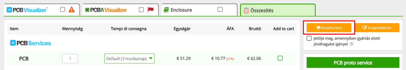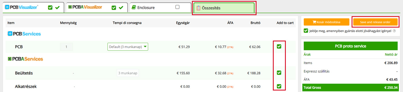 Ezután kattintson az Összesítés fülre, majd győződjön meg arról, hogy a PCB, a Beültetés és az Alkatrészek sorok jelölőnégyzete ki van választva a Kosárba helyez oszlopban.