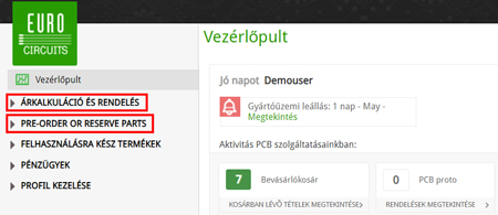 Alkatrész-előrendelés indításához először jelentkezzen be Eurocircuits fiókjába, ami a Vezérlőpult képernyővel nyílik meg.