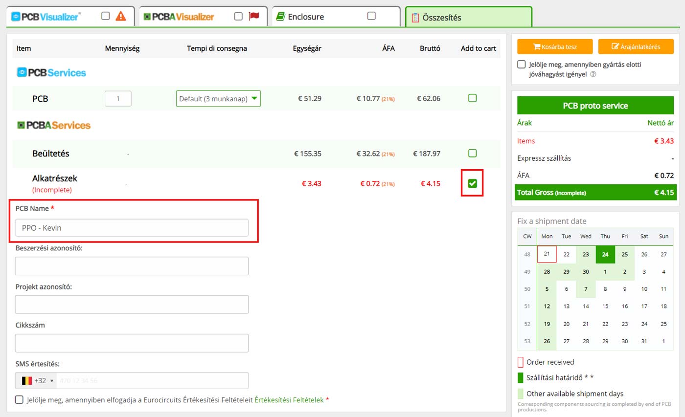 vagy - A végleges PCB gyártási és beültetési megrendelés elküldését követően gondoskodunk az összes további, nem előzetesen megrendelt alkatrész beszerzéséről – Ez bizonyos alkatrészek elérhetőségétől függően azonban az átfutási idő növekedését okozhatja.
