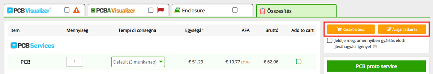 A jobb felső sarokban két narancssárga gombot talál: Kosárba helyez és Árajánlatkérés. Előbbivel elmentheti a BOM-ot a Bevásárlókosárba, utóbbival kollégáink segítségét kérheti az árajánlat megküldésében.