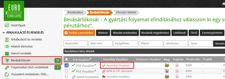 A Bevásárlókosár menüpont alatt nyissa meg az Assembly Visualizert az ellenőrizni kívánt kosárelem sorában!