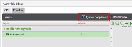 • Checker – Ez a fül a Beültetés ellenőrző (Assembly Checker), ahol felülvizsgálhatja az adatelemzés során talált, az alkatrészek elhelyezésével kapcsolatos problémákat.