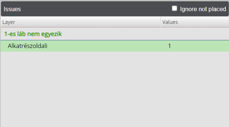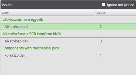 A Beültetés ellenőrző lehetővé teszi a PCB és a BOM/CPL adatok között talált problémák áttekintését, mint például: