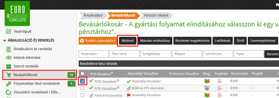 Válassza ki a megfelelő Bevásárlókosár elem sorának elején lévő négyzetet, majd kattintson a fenti Módosít gombra!
