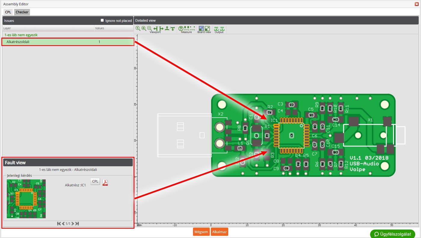 • Részletes nézet (Detailed view) – A PCB jelenik meg grafikusan az aktuálisan kiválasztott probléma kiemelésével.