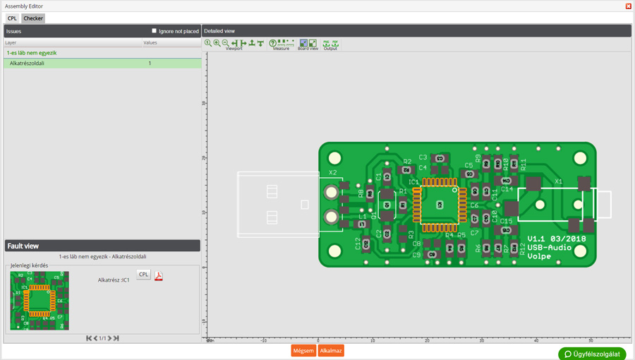 A Beültetés ellenőrző (Assembly Checker) a PCBA Visualizer része, amely információt nyújt a PCB elrendezés és az alkatrész elhelyezés (CPL) között talált problémákról.