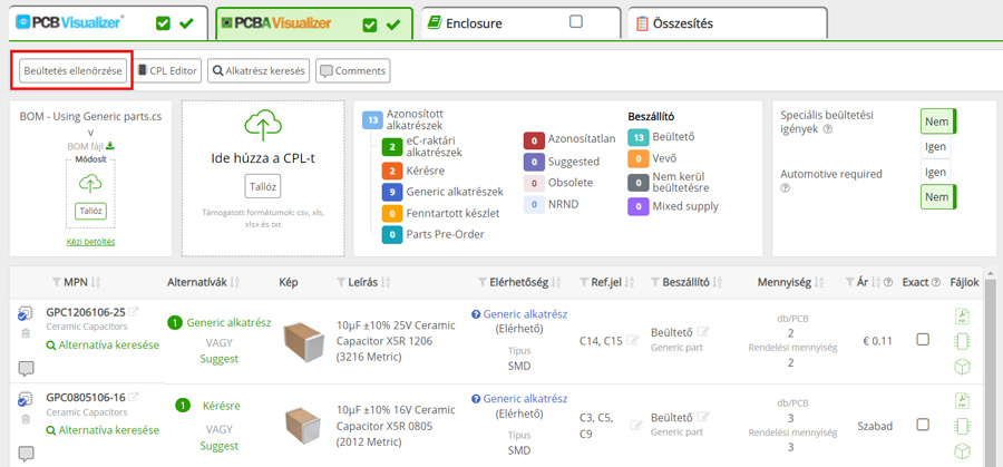 A Beültetés ellenőrző csak akkor érhető el, amennyiben a PCB, a BOM és a CPL adatok feltöltésre kerültek, továbbá a gyors elemzés vagy a teljes elemzés végbement a dokumentáción.