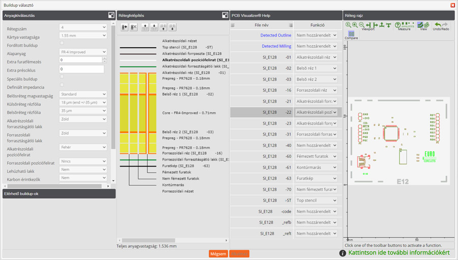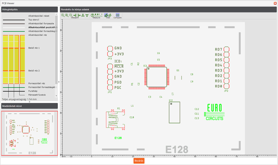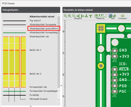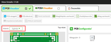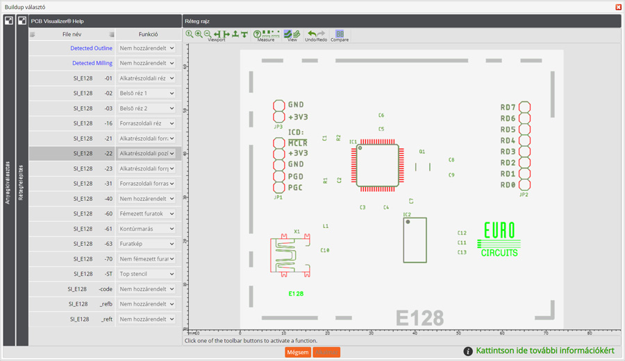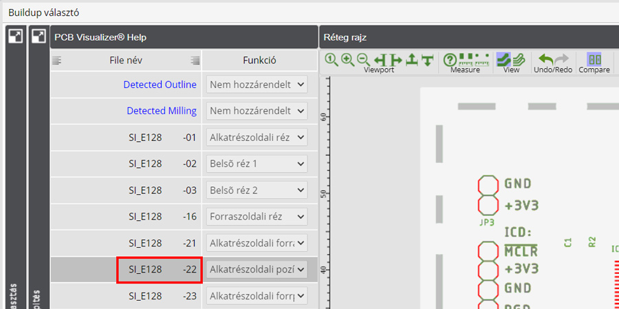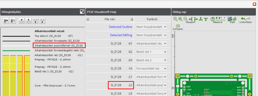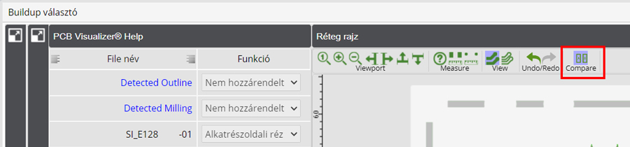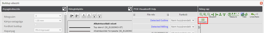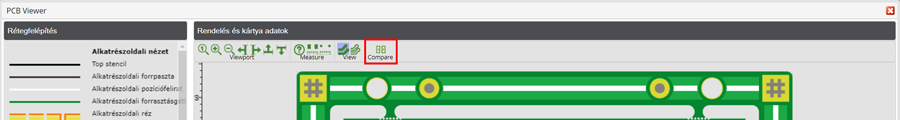A PCB Visualizer rendelkezik egy Összehasonlítás funkcióval, amely lehetővé teszi, hogy összehasonlítsa a feltöltött vevői dokumentációt a gyártási dokumentációval (SI vagy Single Image adatkészlet).