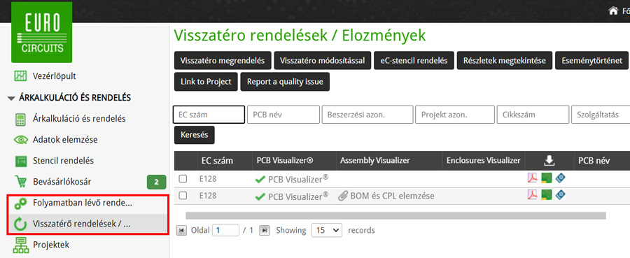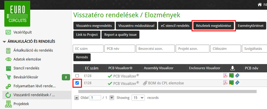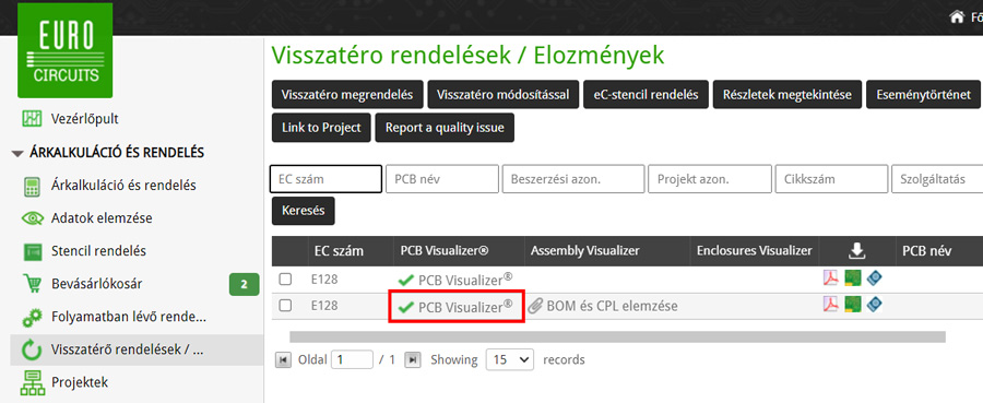 Ezután kattintson a PCB Visualizer linkre a megfelelő megrendelés sorában.